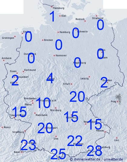 Bei den bis Freitag 00 UTC zu erwartenden Niederschlagsmengen geht der Norden meistens wieder leer aus. In der Südhälfte hingegen entladen sich teils kräftige Regengüsse und Gewitter. Die Mengen können auf engstem Raum wieder sehr unterschiedlich ausfallen und von den in der Karte eingetragenen gemittelten Werte noch deutlich nach oben abweichen. Örtlich sind über 50 Liter pro Quadratmeter zu erwarten.
