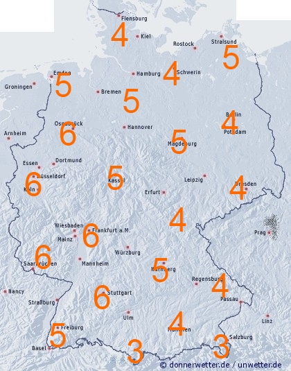 Die aktuelle potentielle Verdunstung liegt wegen der momentan warmen und trockenen Witterung recht hoch. Pro Tag verdunsten in Deutschland allgemein zwischen 4 und 7 Liter pro Quadratmeter. In geschützten Lagen der Mittelgebirge und Alpen fällt die Verdunstung niedriger aus.