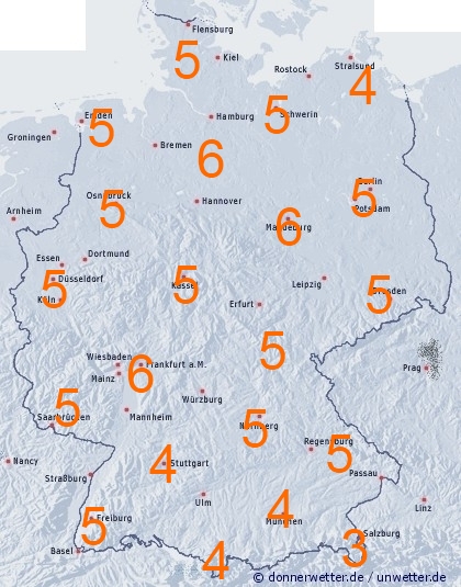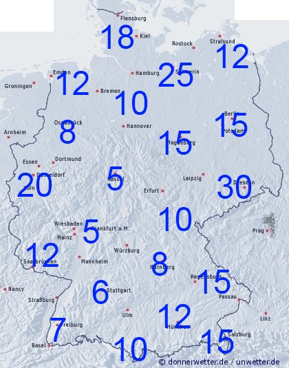 Bis zum Wochenende dominiert freundliches und heißes Hochsommerwetter. In schwül-heißer Luft können sich örtliche Schauer und Gewitter bilden. Eine schwache Front, die uns von Westen her überquert löst dann vermehrt teils kräftige Gewittergüsse aus. Die bis Montag 00 UTC zu erwartenden Regenmengen können schon auf kürzester Distanz deutlich voneinander abweichen. Im Mittel sind Niederschlagssummen zwischen 5 und 30 Liter pro Quadratmeter zu erwarten. Bei Unwettern drohen jedoch Platzregen, Hagel und kleinräumige Überschwemmungen mit Niederschlagsmengen von deutlich über 50 Liter pro Quadratmeter.