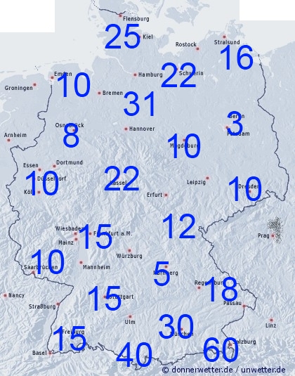 Anfangs fällt an den Alpen noch Dauerregen. Das Schauer- und Gewitterrisiko ist sonst zunächst nur gering, nimmt aber am Wochenende von Westen her wieder zu.