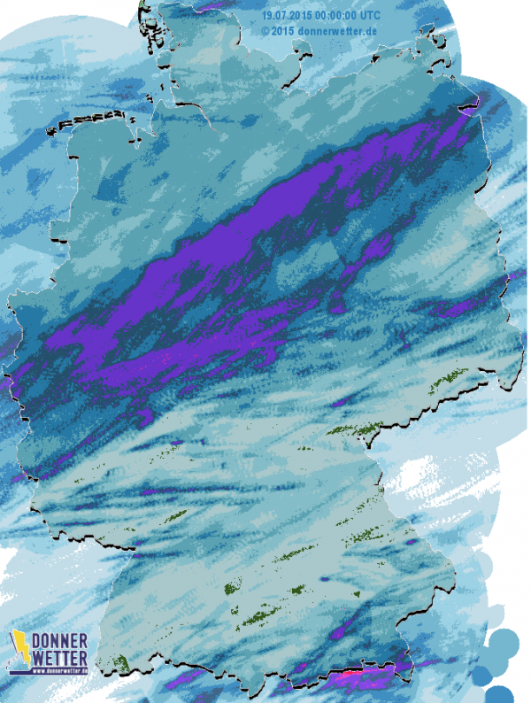 Schauer und Gewitter zogen von Westen her über Deutschland hinweg. Es regnete besonders in der Mitte. Der Weg der Gewitter nach Nordosten ist gut zu sehen.