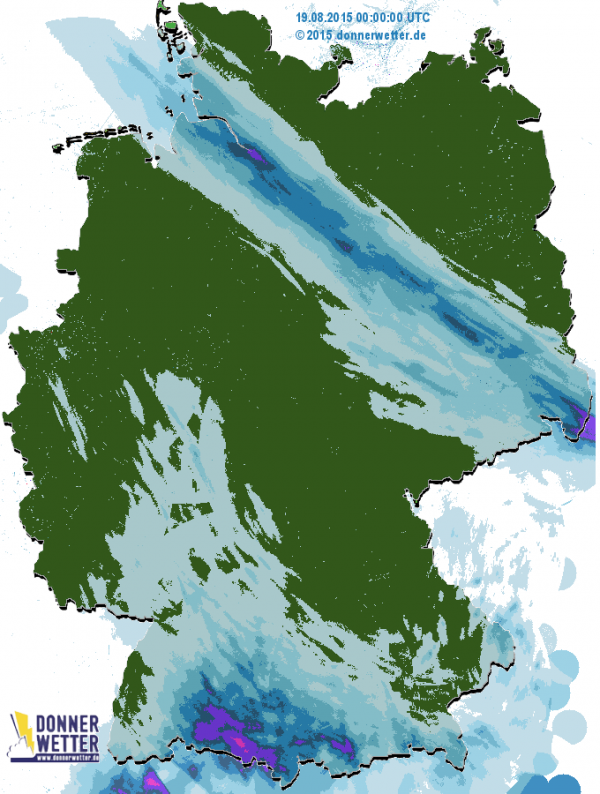 Sehr gut ist das Regenband zwischen der sächsischen Schweiz und der Elbemündung zu sehen. Es regnet hier bis zu 30 l/m2 über den ganzen Tag. Heute bleiben daraus nur ein paar Schauer übrig. Am Alpenrand und Bodenseeraum regnete es durch Schauer und Gewitter. Heute ist es trockener.Bis zur Mitte schafften es nur wenige Schauer.