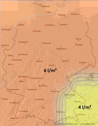 Dann zogen Ausläufer eines Tiefs mit Regen im Schlepptau über die Ostsee auf die deutsche Küste zu und überquerten bis zum Abend einen Streifen zwischen Ostseeküste und Oberlausitz. Regenmengen von mehr als 10 Liter pro Quadratmeter blieben jedoch die Ausnahme.