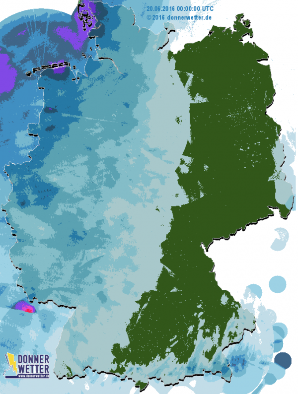 Den Westen erreichten hingegen am Nachmittag erste Ausläufer eines Tiefs über dem Atlantik. Diese "arbeiteten" sich im Lauf des Abends und der ersten Nachthälfte bis auf die Höhe von Magdeburg und Nürnberg vor. Die höchsten Niederschlagsmengen wurden dabei im äußersten Westen zwischen der dänischen Grenze und dem Niederrhein erzielt. Hier kamen bis Mitternacht 10 bis 20 Liter Niederschlag pro Quadratmeter zusammen.