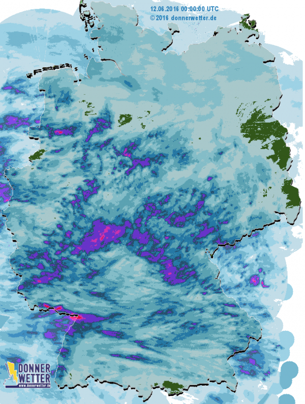 Von den Küsten bis an die Alpen regnete es beinahe allerorts. Im südlichen Niedersachsen, im Raum Frankfurt, in Teilen Frankens und in der südlichen Pfalz fielen diese Niederschläge zum Teil auch wieder kräftig aus. Lokal kamen Regenmengen bis zu 50 Liter pro Quadratmeter zusammen.