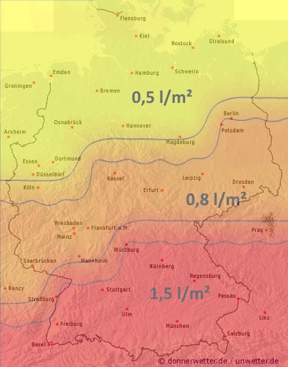 Heute kühlt es von Westen her ab und es kommt zu einigen Schauern. Vor allem im Süden und Osten, also dort, wo die kühle Luft auf die noch schwül-warme Luftmasse trifft fällt zum Teil kräftiger Regen. Örtlich blitzt und donnert es dabei. Gebietsweise sind Regenmengen zwischen 20 und 50 Liter pro Quadratmeter zu erwarten.