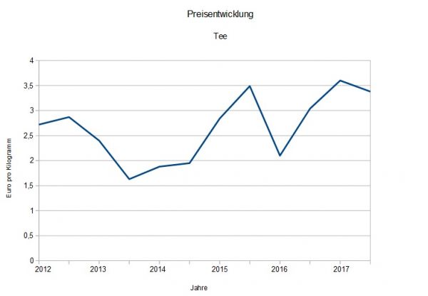 Der Tee Preis war vor fünf Jahren noch um einiges billiger, steht aber auch unter ständigen Schwankungen. Im Vorjahr gab es einen Tiefpreis und nun scheint der Preis wieder zu steigen.