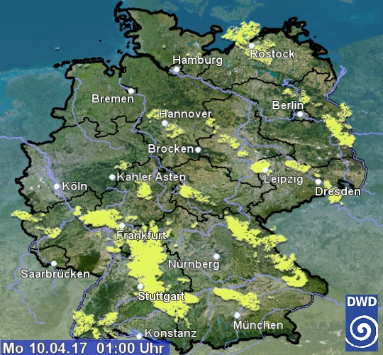 Die Kaltfront, die uns heute von Nordwest nach Südost überquert macht sich mit Wolken und anschließend deutlich kühlerer Luft bemerkbar. Sie löst vor allem in der Südosthälfte unseres Landes teilweise Regengüsse und Gewitter aus. Die Niederschlagsverteilung ist dabei recht unterschiedlich. In kräftigen Schauern können teilweise über 10 Liter / m² erreicht werden. Sonst liegen die Mengen meist zwischen 1 und 6 Liter / m².