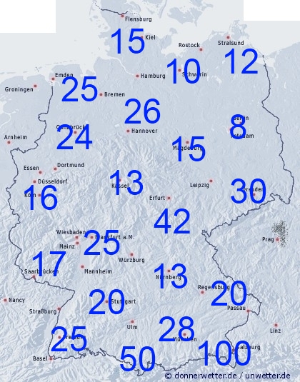 Die bis Montag 00.00 Uhr zu erwartenden Niederschlagsmengen werden sehr unterschiedlich auftreten, da sie meist in Form von Schauern und Gewittern fallen. Im Nordosten unseres Landes werden die Mengen eher niedriger ausfallen, sonst kann es regional zu großen Unterschieden kommen. Am Alpenrand sind vermutlich Mengen von 50 bis 100 Liter, stellenweise auch noch mehr zu erwarten.