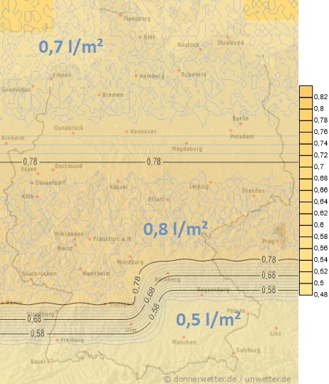 Heute zieht der Niederschlag von Nordwest nach Südost. Dabei fällt anfangs zum Teil Schnee, bald in der Nordwesthälfte jedoch überwiegend Regen oder Sprühregen. Im Südosten kommt der Niederschlag erst später an und fällt vor allem in höheren Lagen meist in Form von Schnee. Die Mengen liegen dabei allgemein zwischen 1 und 10 Liter pro Quadratmeter.