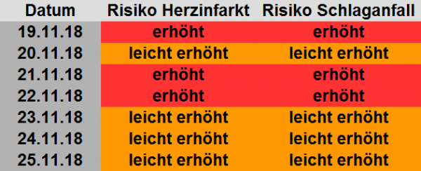 Nach einigen ruhigen Tagen steigen die wetterbedingten Schlaganfall- und Herzinfarktrisiken mit dem Einfluss kälterer Luft in den kommenden Tagen wieder an.