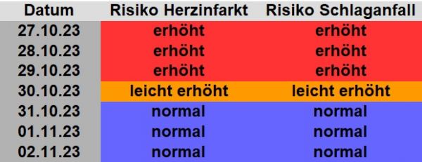 Bei weiterhin milden Temperaturen und wechselhaftem Wetter sind die Schlaganfall- und Herzinfarktrisiken vor allem über das Wochenende erhöht.