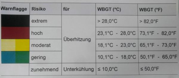 Die untere Tabelle zeigt das jeweilige Risiko, das über den WBGT Wert ermittelt werden kann.