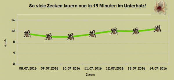 Das feuchte und zum Teil sehr warme Wetter am Wochenende feuert die eh schon extrem hohen Zeckenzahlen nochmals an. Bis zur Mitte der neuen Woche finden sich im Unterholz bis zu 13 Zecken in 15 Minuten.