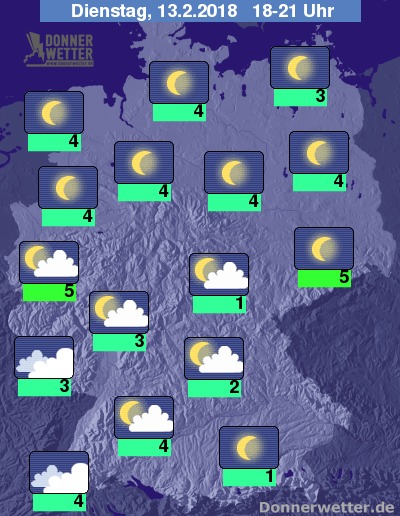 Heute Abend verdichten sich die Wolken im äußeren Westen und Südwesten, sonst ist es hingegen weiterhin nur locker bewölkt und vor allem über der Nordosthälfte des Landes weitgehend sternenklar. Die Temperatur liegt zwischen 1 und 5 Grad.