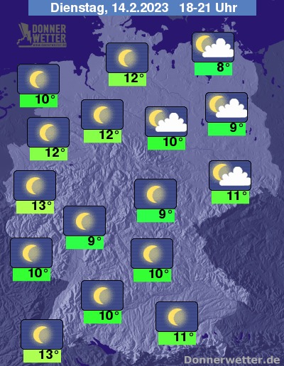 Heute Abend ist es zum Großteil sternenklar, lediglich im Osten hält sich hier und da nur lockere Bewölkung. Bei Temperaturen von 8 Grad in Rostock und bis 13 Grad in Freiburg bleibt es überall trocken.