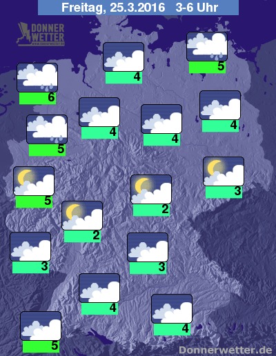 In der Nacht zum Freitag ist es über der breiten Landesmitte anfangs noch teils aufgelockert bewölkt, sonst hält sich jedoch weitgehend dichte Bewölkung und zunächst regnet es nur im Norden und Westen zeitweise. Bis zum Morgen ziehen die dichten Regenwolken aber auch in den Süden und Osten Deutschlands. Die Temperatur sinkt auf 6 Grad an der niederländischen Grenze und bis 2 Grad in Oberfranken.