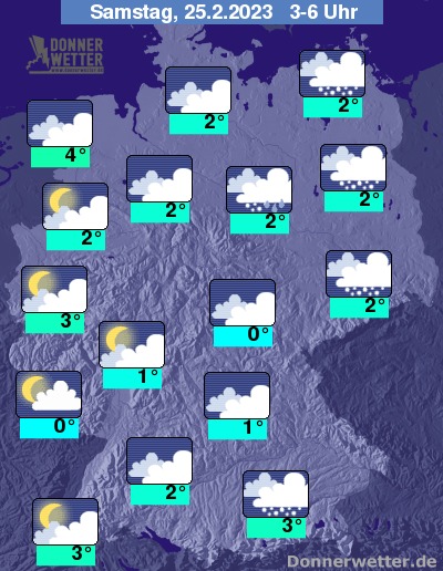 In der Nacht zum Samstag ist es über dem Westen und Südwesten oft locker bis noch aufgelockert bewölkt und trocken. Im übrigen Land hält sich eine weitgehend verschlossene Wolkendecke und vor allem im Südosten, sowie von Sachsen bis hoch zur Ostsee fällt verbreitet Schnee, zum Teil auch Schneeregen. Die Temperatur sinkt auf 4 Grad in Wilhelmshaven und 0 Grad in Jena. Im Norden und Osten weht ein starker und teils stürmischer Wind, an den Küsten herrscht stellenweise sogar Sturm.