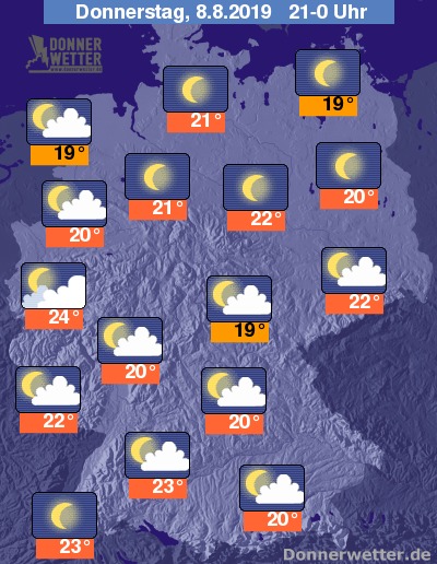 Bis zu den Frühstunden kühlt die Luft im Norden, sowie in den Mittelgebirgen auf 12 bis 16 Grad ab, im Süden und Südwesten bleibt es mit Werten zwischen 15 und 19 Grad um einiges milder.