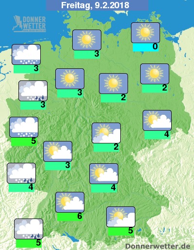 Nach einer verbreitet nochmals eisigen Nacht wechseln sich längere sonnige Abschnitte mit einigen Nebelfeldern- oder zäher hochnebelartiger Bewölkung ab. Im Westen werden die Wolken im Tagesverlauf immer dichter und zum späten Nachmittag oder Abend beginnt es leicht zu schneien. In tieferen Lagen fällt zum Teil auch Schneeregen. In der Nacht auf Samstag schwenkt das Schneefallgebiet über Baden-Württemberg hinweg Richtung Alpen. Die Höchsttemperaturen bewegen sich zwischen -1 und 6 Grad. Der Wind kann im Nordwesten auffrischen, sonst weht er meist nur schwach.