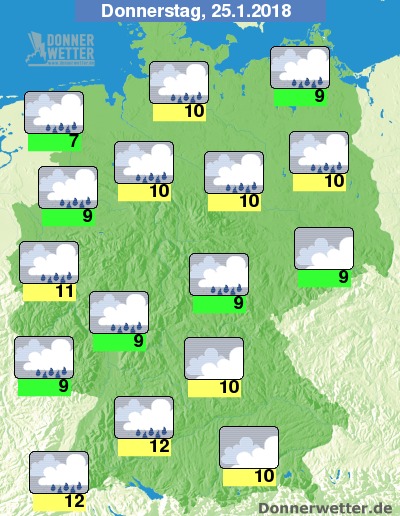 Am Donnerstag bleibt es über Bayern und Sachsen oft stark bewölkt oder trüb, jedoch trocken. Im übrigen Bundesgebiet ziehen hingegen dichte Wolken durch und es fällt immer wieder oder auch langanhaltender Regen. Die Temperatur erreicht 7 bis 12 Grad.