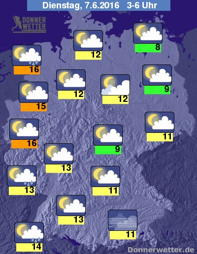 In der bevorstehenden Nacht sind entlang des Oberrheins und an der Nordsee lokale Schauer und Gewitter möglich. Im übrigen Bundesgebiet ist es meist locker bis aufgelockert bewölkt und es bleibt trocken. Die Temperatur sinkt auf 16 Grad am Niederrhein und etwa 8 Grad an der Müritz.