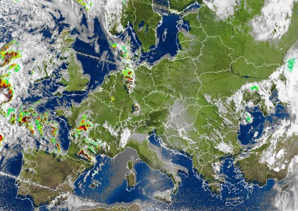 Auf dem Satellitenfoto von heute Morgen präsentiert sich der europäische Kontinent verbreitet freundlich mit oft nur geringer Bewölkung oder auch wolkenlosem Himmel. Besonders über Frankreich, aber auch bspw über Norddeutschland sind einige Gewitterzellen zu erkennen, hier traten bereits am Morgen teils kräftige Unwetter auf.
