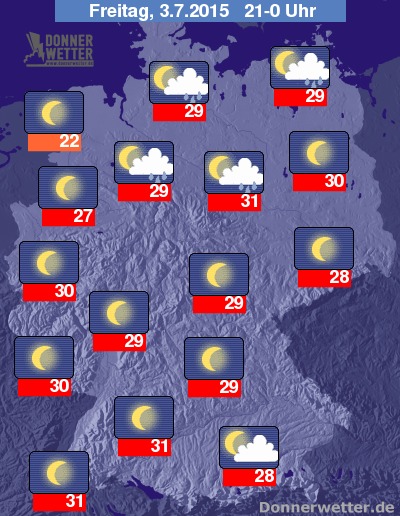 Heute Abend besteht im Norden und Nordosten des Landes ein meist leichtes Gewitterrisiko, dort wo regionale Gewitter auftreten, können diese jedoch heftig ausfallen. Auch am Alpenrand sind örtliche Gewitter möglich. Im übrigen Bundesgebiet bleibt es dagegen verbreitet sternenklar und trocken. Die Abendtemperatur liegt bei teils schwülheißen 31 Grad in Magdeburg und bei etwas kühleren 22 Grad an der Nordsee.