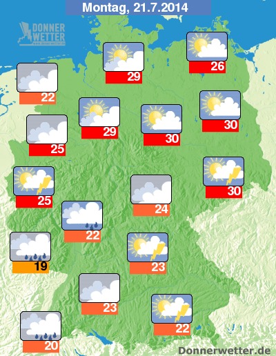 Am morgigen Montag erwarten wir eine Zweiteilung beim Wetter. Während es nach Nordosten vielfach freundlich und trocken bleibt, bilden sich im übrigen Land unter meist dichten Wolken immer wieder Schauer und Gewitter, vielfach regnet es auch andauernd und ergiebig. Weiterhin im Westen und Süden Unwettergefahr. Die Temperatur steigt auf kühle 19 Grad im Hunsrück und auf 30 Grad in der Lausitz.
