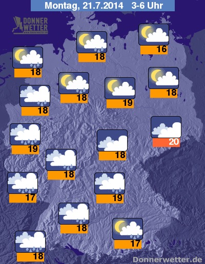 In der kommenden Nacht ziehen vielfach dichte Wolken übers Land, dabei kann es nur hier und da etwas auflockern. Es bilden sich gebietsweise gewittrige Schauer. Besonders im Südwesten Deutschlands droht Unwettergefahr durch starke Regenfälle durch Gewitter. Bis Morgen können die Starkregenfälle sich bis NRW ausdehnen.