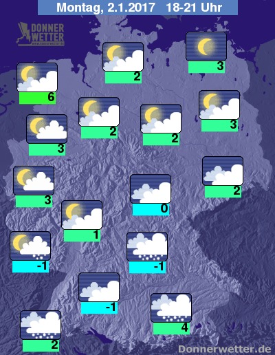 In der Nacht zum Dienstag ziehen von Nordwesten her oft dichte Wolken mit Regen, Schneeregen oder Schnee in den Norden und Osten Deutschlands, dazwischen lockert die Bewölung jedoch auch auf und es bleibt dann trocken. Es besteht oft Glättegefahr! Weiter nach Süden und Westen hin zeigt sich der Himmel überwiegend nur locker bewölkt oder sternenklar, dazu bleibt es trocken. Stellenweise ist Nebel möglich. Die Temperatur sinkt auf 4 Grad an der Nordsee und bis -5 Grad im Saargau.
