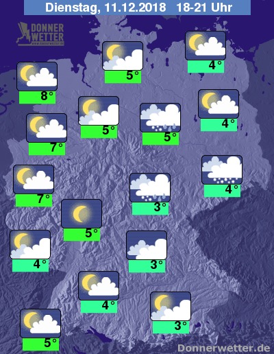 Die Temperaturen liegen zu Dämmerungsbeginn noch zwischen 3 Grad in Bayern und 8 Grad im Emsland.