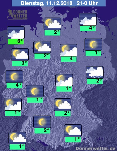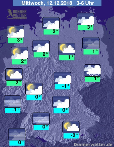 Bis zu den Frühstunden kühlt die Luft auf -2 Grad im Süden und plus 3 Grad im Emsland ab. Es muss verbreitet mit Glätte durch überfrierende Nässe und Reif, in den östlichen Mittelgebirgen auch Schnee gerechnet werden.