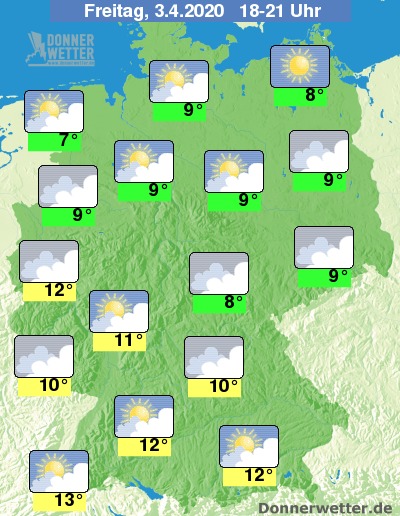 Am Abend dominieren vor allem über der Landesmitte noch dichtere Wolken. Die zunächst noch auftretenden örtlichen Niederschläge oder Schauer lassen aber langsam nach. In den übrigen Gebieten teilt sich die allmählich untergehende Sonne das Regiment mit meist nur lockeren Wolkenfeldern.