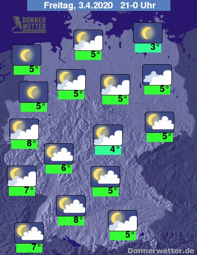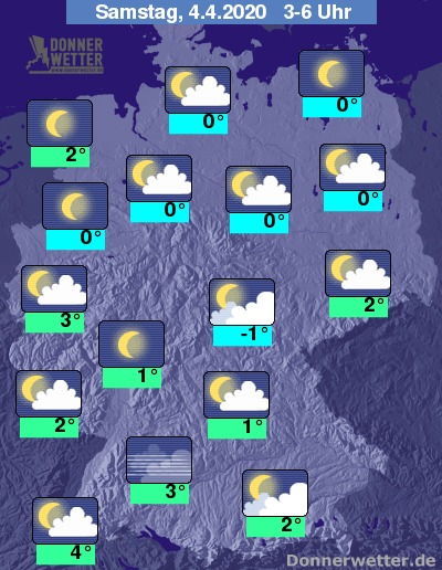 Bis zu den Frühstunden kühlt die Luft auf 0 bis 4 Grad ab. In den Mittelgebirgen, sowie im Norddeutschen Tiefland gibt es häufig auch leichten Frost.