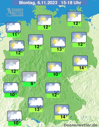 Die Temperaturen erreichen Werte um 9 Grad in Rhein-Main-Gebiet und 14 Grad am Alpenrand.