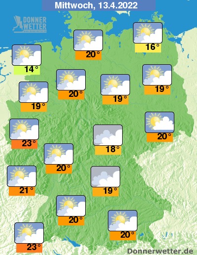 Am Mittwoch zeigen sich häufig heitere Abschnitte, gebietsweise ziehen aber auch dichtere Wolken durch, dabei bleibt es trocken. Die Temperatur steigt auf 14 Grad an der Nordsee und bis 23 Grad am Rhein.