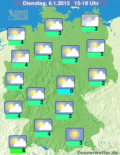 Heute Nachmittag ist es im äußeren Norden, im Nordosten sowie im Osten Deutschlands oft stark bewölkt oder trüb, dazu bleibt es jedoch weitgehend trocken. In den anderen Landesteilen kann sich dagegen verbreitet die Sonne zwischen meist nur lockeren Wolkenfeldern zeigen. Besonders im Süden ist es auch oft sonnig. Es bleibt trocken. Die Temperatur liegt bei 0 Grad im Grabfeld und um 6 Grad im Breisgau.