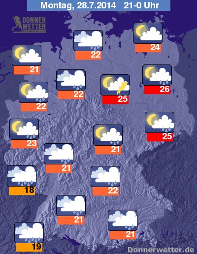 Heute Abend sind weiterhin noch teils kräftige Schauer und Gewitter möglich, vor allem nach Süden sind verbreitet gewittrige und ergiebige Regenfälle möglich. Im Norden ist es überwiegend trocken. Die Abendtemperatur liegt bei schwülwarmen 26 Grad in Berlin und kühleren 18 Grad in der Südeifel.