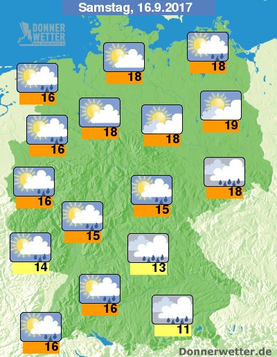 Die Temperaturen erreichen für Mitte September unwürdige 11 Grad C im verregneten Oberbayern und 19 Grad C in Berlin.