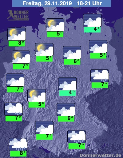 Am Abend fällt an den Alpen zeitweise Niederschlag, in höheren Lagen meist in Form von Schnee, sonst als Regen. Im übrigen Land bleibt es bis auf einzelne Schauer trocken und die Wolkendecke lockert teilweise auf.