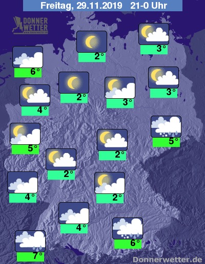 Bis Mitternacht sinkt die Schneefallgrenze an den Alpen weiter, auch über den östlichen Mittelgebirgen kann es noch zu örtlichen Schauern, teils Regen, teils Schnee kommen, sonst zeigen sich neben dichteren Wolken auch mal die Sterne. Vor allem im Norden klart der Himmel vermehrt auf.