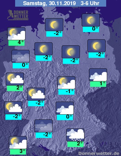 Bis zu den Frühstunden kühlt die Luft häufig in den Frostbereich zwischen -3 und 0 Grad ab und es muss mit Glätte durch Reif oder überfrierender Nässe gerechnet werden. Am mildesten bleibt es an der Nordsee.