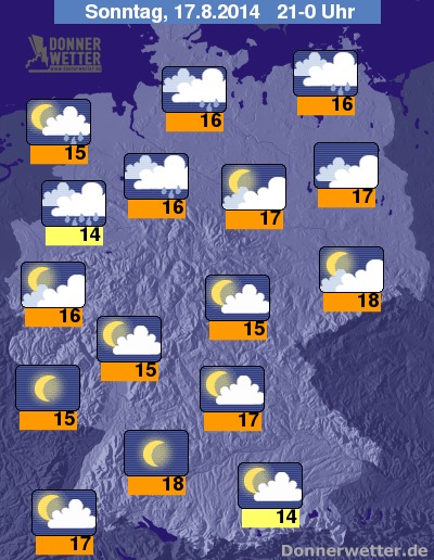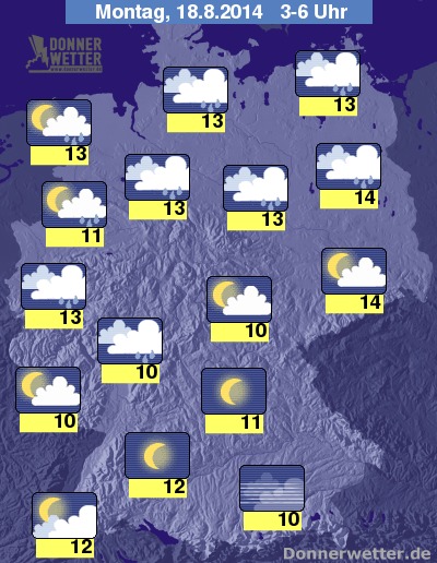 In der Nacht zum Montag ziehen die dichten Wolken mit zeitweiligem Regen auch in die Mitte Deutschlands, vor allem in der Südosthälfte des Landes bleibt es bei meist aufgelockerter Bewölkung aber trocken. Die Temperatur sinkt auf 14 Grad in Berlin und kühle 10 Grad am Spessart.