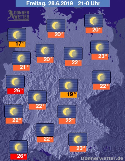 Am frühen Abend bewegen sich die Temperaturen im Norden und Nordosten zwischen 19 und 25 Grad, im Süden und Südwesten noch bei sehr warmen bis heißen 26 bis 31 Grad.