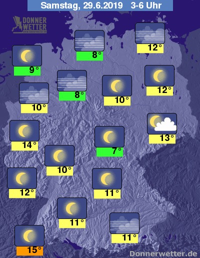 In der zweiten Nachthälfte können sich im Norden stellenweise Nebelfelder bilden, auch an Donau und Inn kann es zu örtlichen Nebelgebieten kommen. Sonst bleibt es meistens sternenklar.