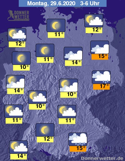 In der kommenden Nacht fällt im Süden und Osten anfangs noch teils kräftiger und teils gewittriger Regen. Zum Morgen hin zieht sich der Regen jedoch aufs Voralpenland und die Lausitz zurück. Im übrigen Land ist es zeitweise sternenklar, oft aber auch aufgelockert bis stark bewölkt, dazu bleibt es zumeist trocken. Die Temperatur sinkt auf 17 Grad in der Lausitz und bis 10 Grad im Münsterland.
