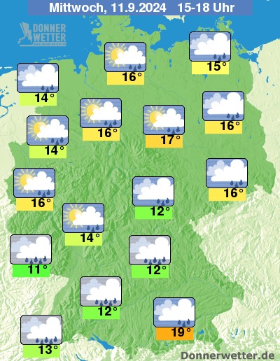Am Mittwochnachmittag zeigt sich der Himmel über weiten Landesteilen wechselnd oder stark bewölkt. Dabei fällt zunächst vom Südwesten bis in den Nordosten Regen, im Tagesverlauf verlagern sich die Niederschlagsgebiete dann in den Südosten. Im Nordwesten gegen Abend Schaueraufzug und einzelne Gewitter.