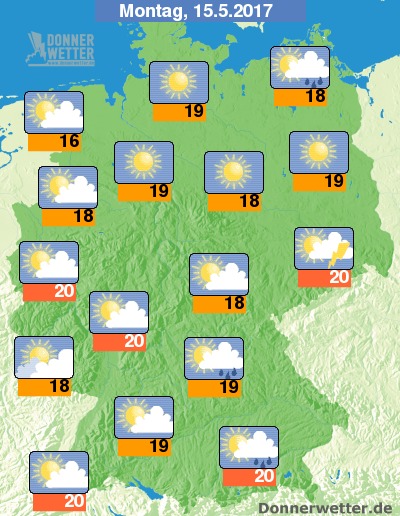 Am Montag ist es meist heiter oder locker bewölkt, zwischen Weser und Oder sind auch längere sonnige Abschnitte möglich. Einzelne Schauer und Gewitter gibt es im Südosten des Landes, sonst bleibt es meist trocken.