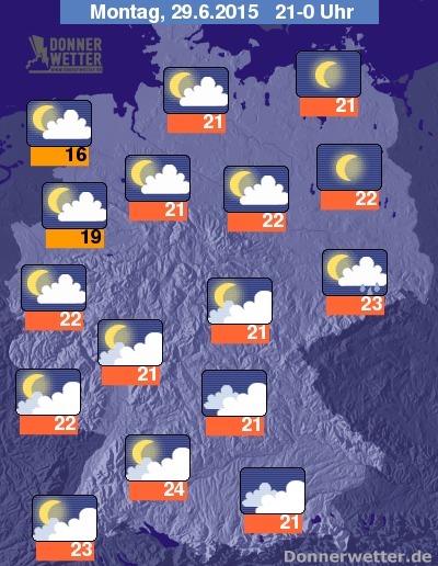 Heute Abend sind in Sachsen letzte Schauer und auch noch einzelne Gewitter möglich, sonst lockert der Himmel verbreitet auf und zum Teil wird es auch sternenklar, dazu bleibt es trocken. Die Abendtemperatur liegt bei 23 Grad im Breisgau und kühleren 16 Grad in Ostfriesland.